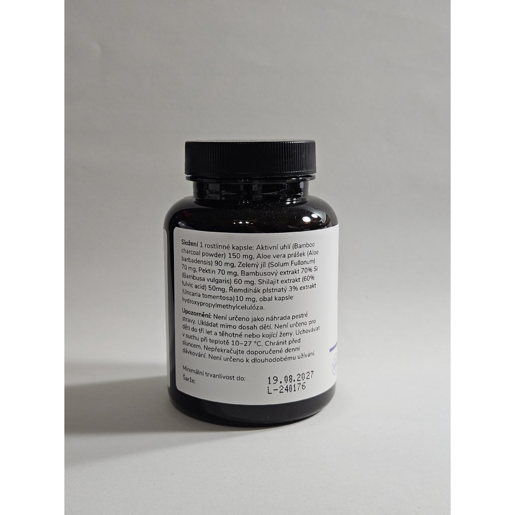 Composition of 1 vegetable capsule: Active charcoal (Bamboo charcoal powder) 150 mg, Aloe vera powder (Aloe barbadensis) 90 mg, Green clay (Solum Fullonum) 70 mg, Apple pectin 70 mg, Bamboo extract 70% Si (Bambusa vulgaris) 60 mg, Shilajit extract (60% fulvic acid) 50mg, Uña de Gato 3% extract (Uncaria tomentosa)10 mg, capsule shell: hydroxypropylmethylcellulose